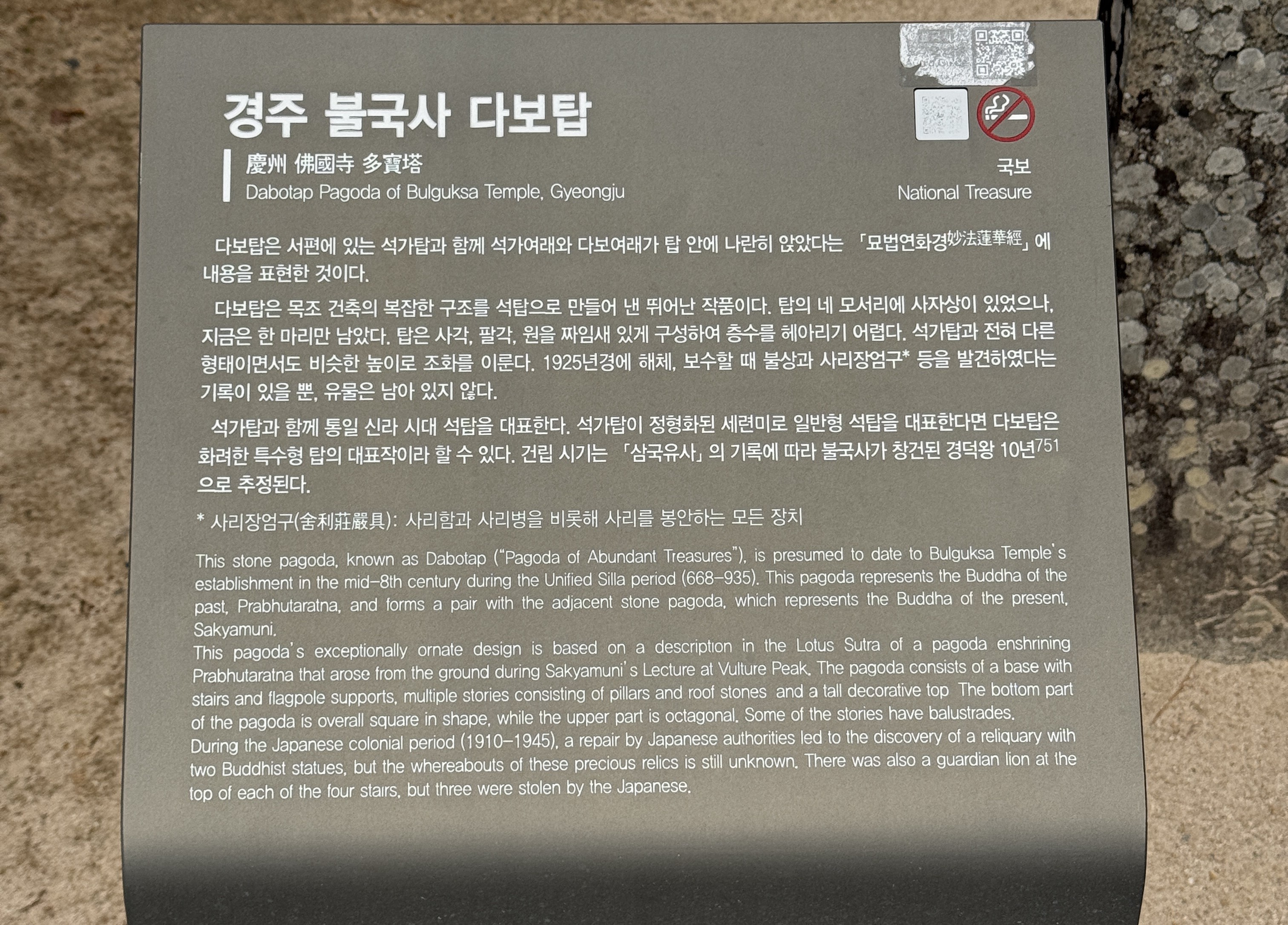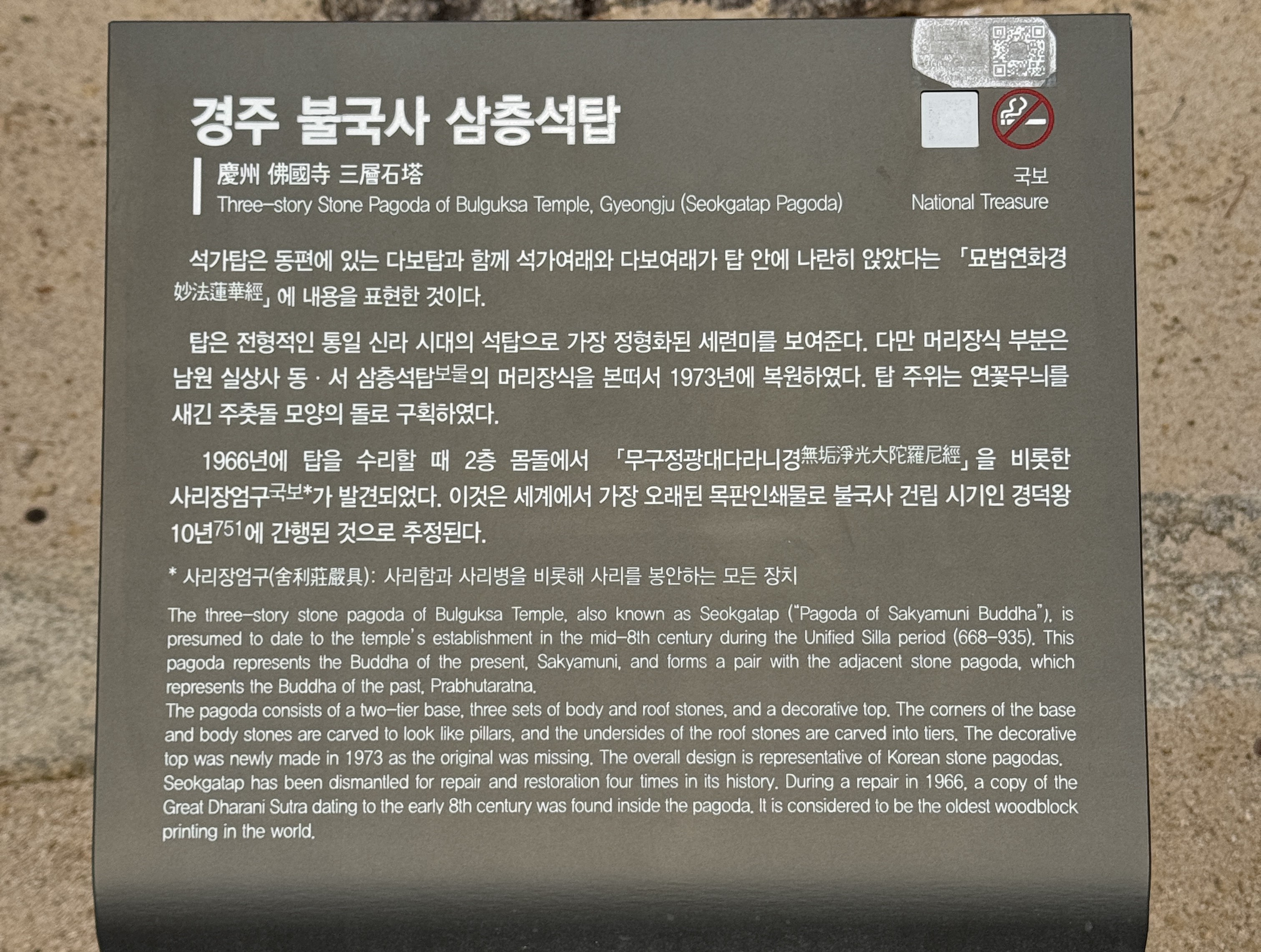 안내판에도 나와있지만 석가탑은 '무구정광대다라니경'을 비롯한 사리장엄구가 발견되었다고 하죠.